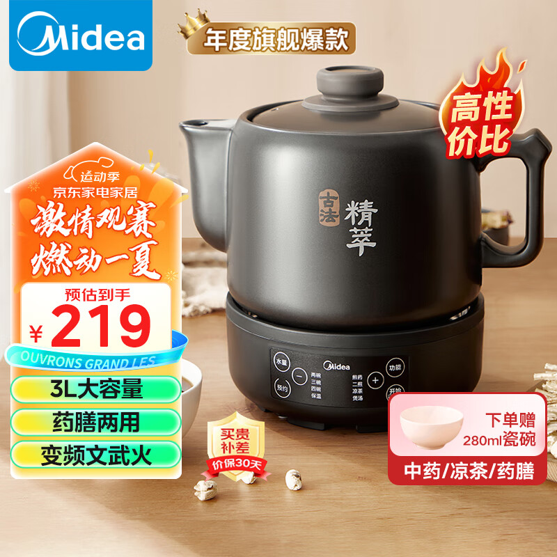 美的(Midea)分体式中药锅中药壶煎药壶3L大容量家用全自动熬药电砂免看管陶瓷药罐药膳煲熬药锅JYC3002价格:219.00元!
