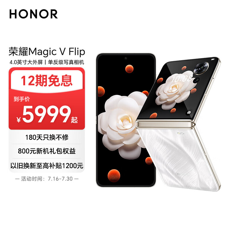 荣耀Magic V Flip 小折叠屏 4.0英寸大外屏 单反级写真相机 青海湖电池 5G AI 拍照手机 12+1T 山茶白价格:5999.00元!