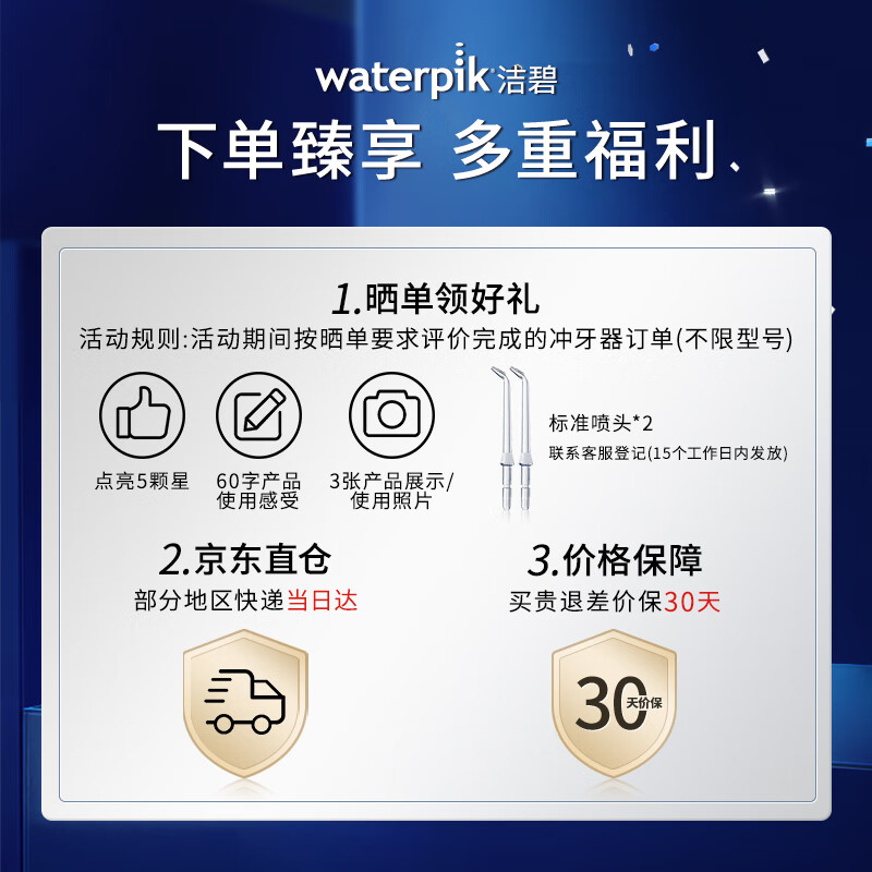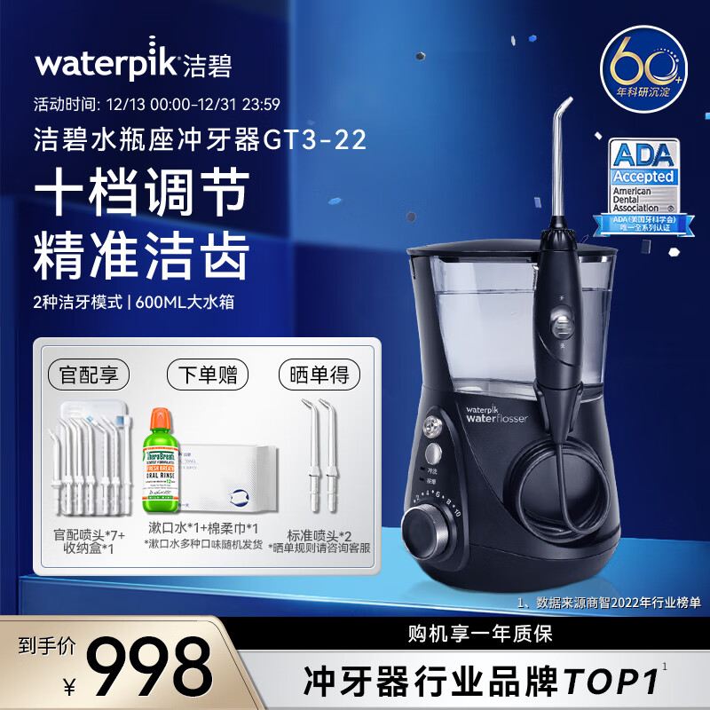 洁碧(Waterpik)冲牙器 便携式电动洗牙器水牙线洁牙器 家用立式预防牙结石正畸适用 全身水洗 水瓶座GT3-22价格:998.00元!
