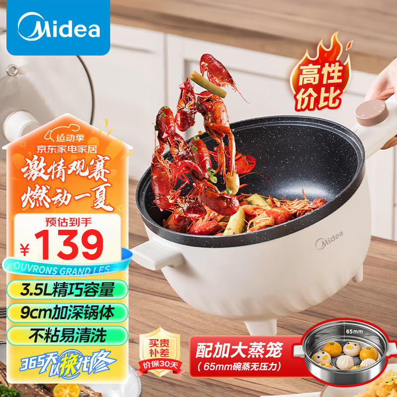 美的(Midea)电炒锅 电煮锅 电蒸锅 电火锅 电热锅 家用多功能 一体电锅蒸煮炒菜 3.5L多用途锅 HGE2515 配蒸笼价格:129.00元!