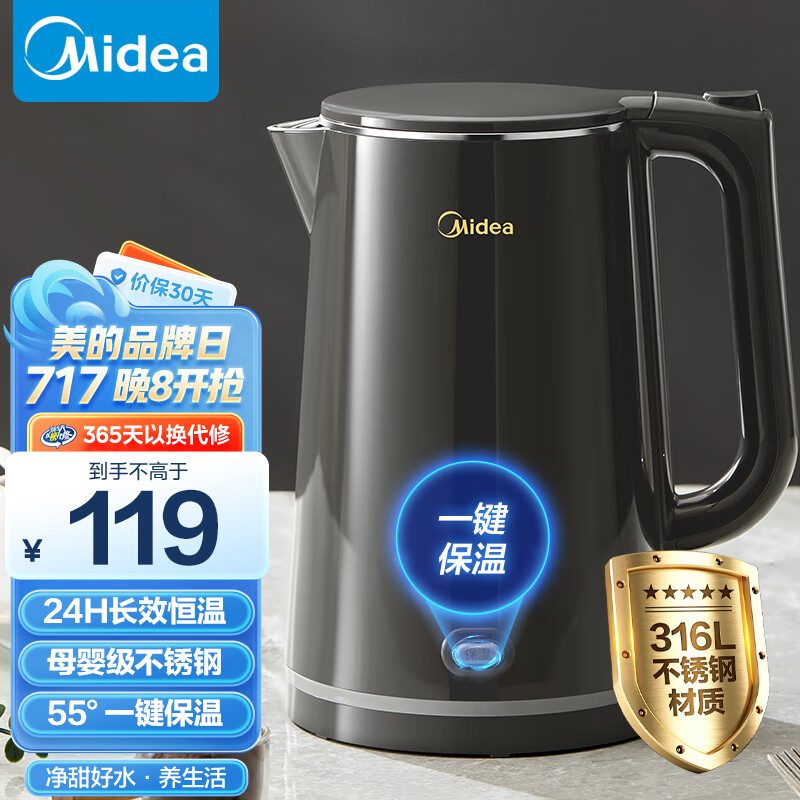 美的(Midea)电热水壶烧水壶恒温水壶一键保温恒温烧水壶净甜开水壶316L不锈钢智能自动断电热水壶SHE1521价格:119.00元!