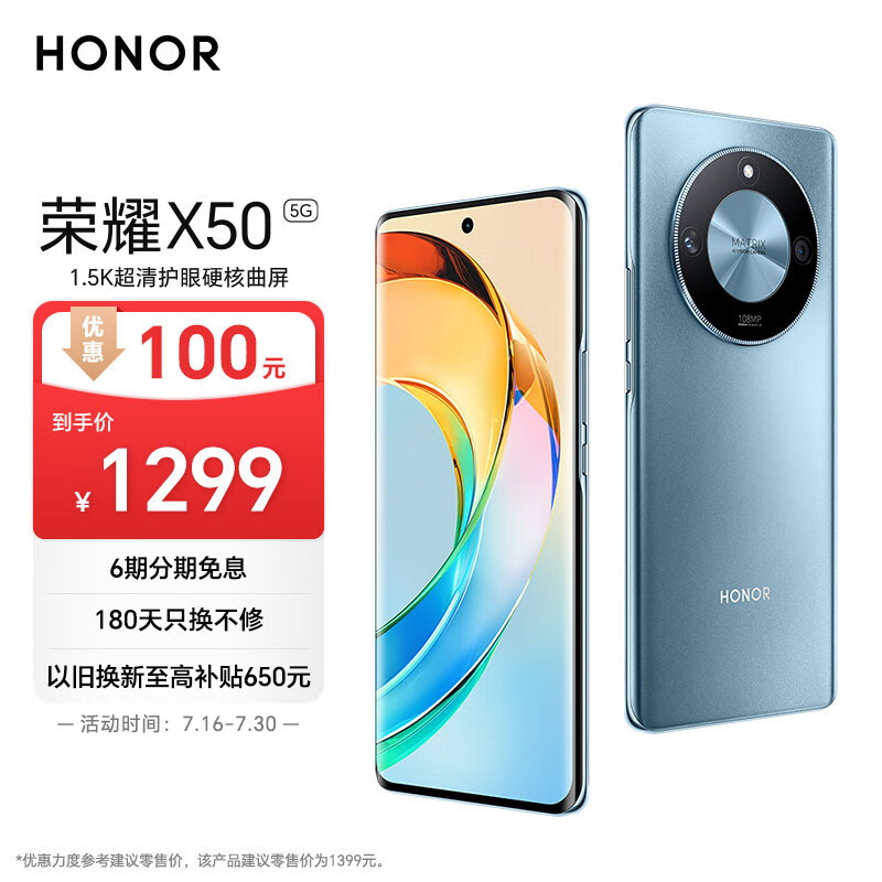 荣耀X50 代骁龙6芯片 1.5K超清护眼硬核曲屏 5800mAh超耐久大电池 5G手机 8GB+128GB 勃朗蓝价格:1399.00元!