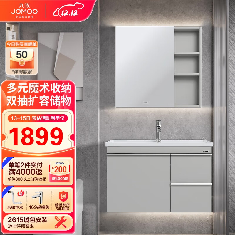 九牧(JOMOO)浴室柜 抗菌陶瓷一体盆极简悬挂式双抽拉 浅灰80cm A2704-117Y-1价格:2299.00元!
