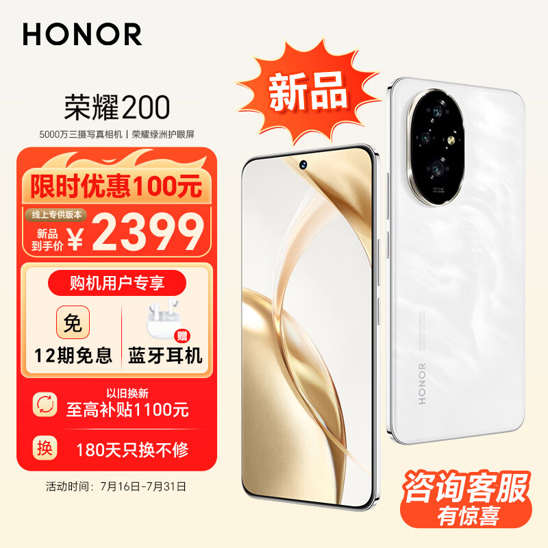 荣耀200 新品 旗舰级青海湖电池 绿洲护眼屏 5000万雅顾光影主摄 第三代骁龙7 AI手机 8+256 月影白 5G价格:2399.00元!