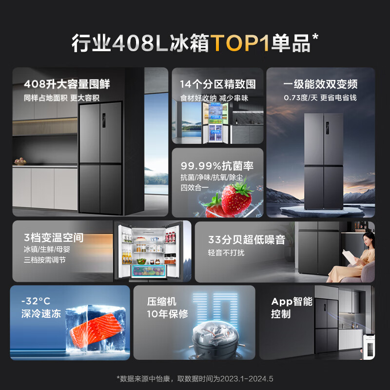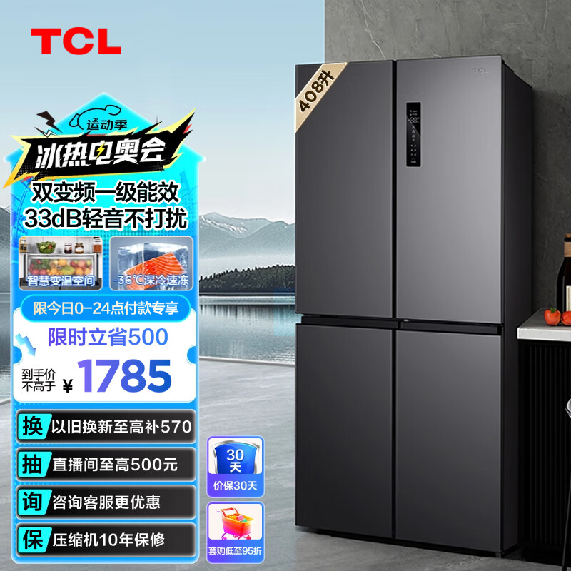 TCL 408升分区养鲜超薄十字对开双开四开多门智能一级能效风冷无霜大容量家用电冰箱BCD-408WPJD价格:1799.00元!