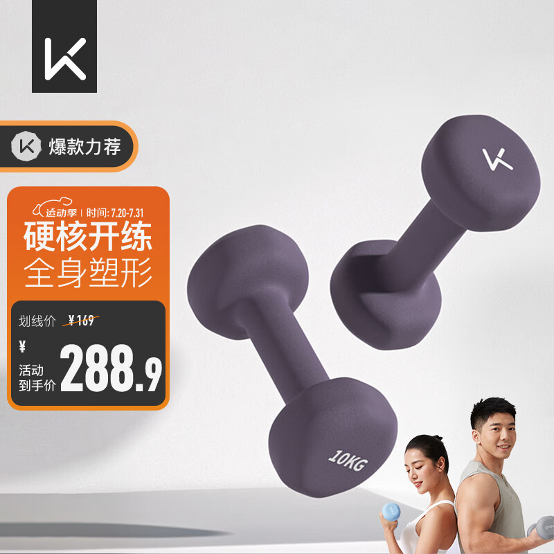 Keep彩色浸塑哑铃男士家用家庭健身肌肉塑形暮山紫 10kg*2价格:280.90元!