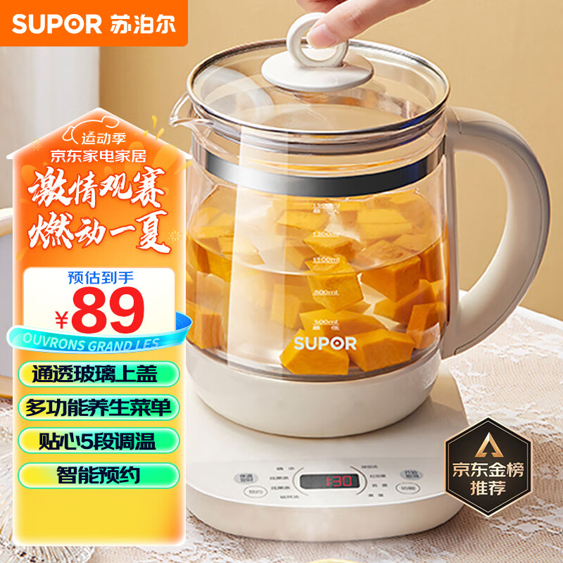 苏泊尔(SUPOR)养生壶 1.5L煮茶器花茶壶 电水壶烧水壶电热水壶开水壶 保温煮茶壶玻璃电茶壶 SW-15YJ33价格:89.00元!