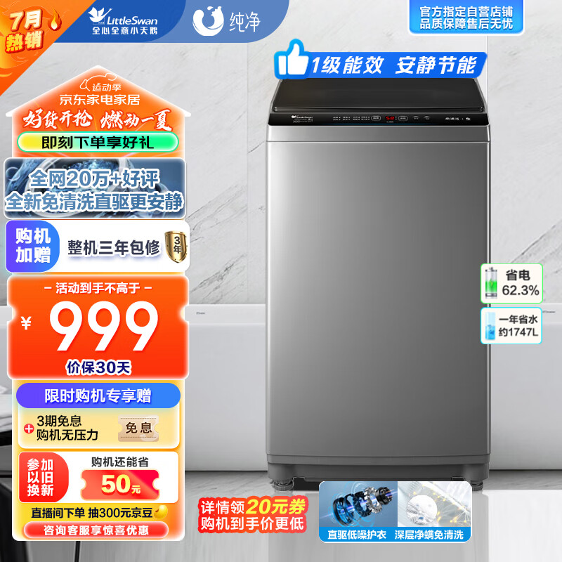 小天鹅(LittleSwan)波轮洗衣机全自动 直驱变频 8公斤大容量 免清洗不脏桶 宿舍 租房神器 以旧换新 TB80V23DB价格:999.00元!