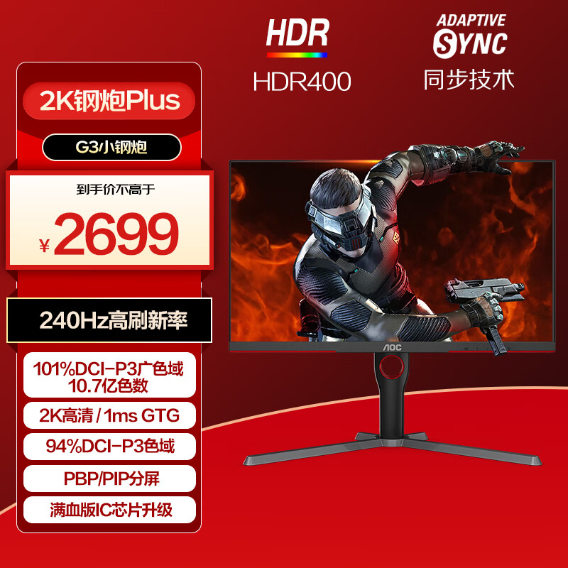 AOC 27英寸 2K IPS快速液晶 240Hz 10Bit全开大乌兹 HDR400 低蓝光不闪 游戏电竞电脑显示器 Q27G3Z价格:2699.00元!