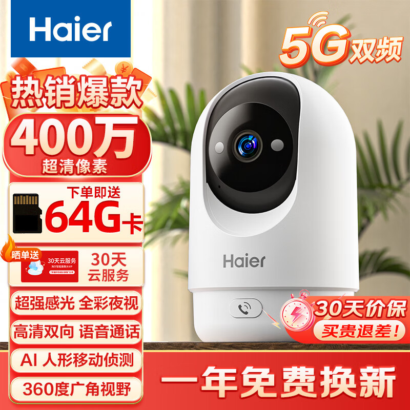 海尔(Haier)无线家用摄像头手机远程监控器360度无死角带夜视全景语音自动旋转可对话室内外云台价格:149.00元!