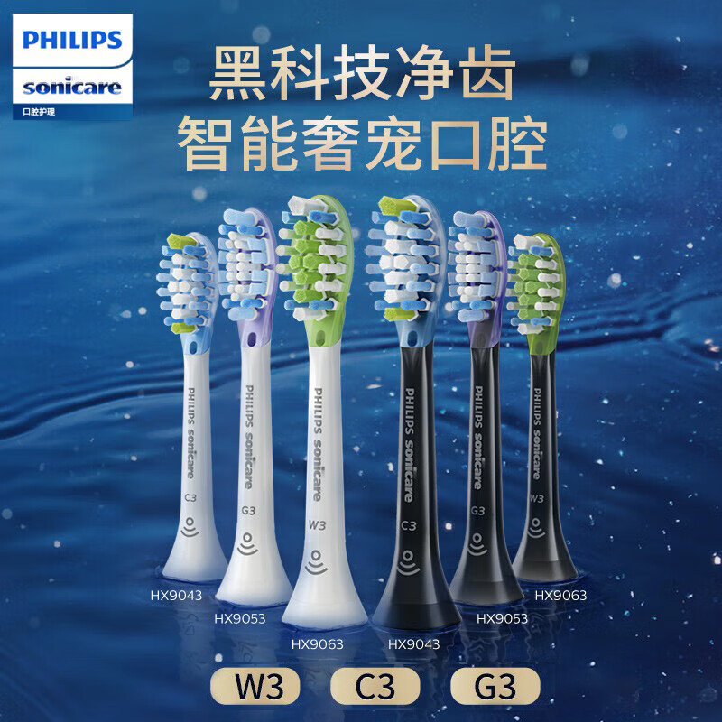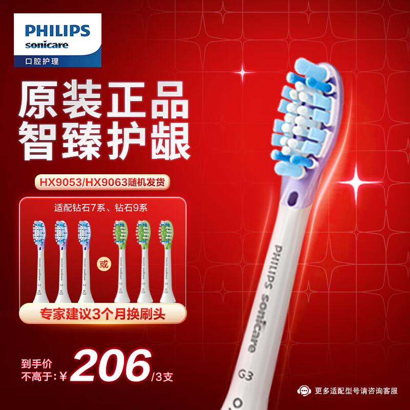 飞利浦(PHILIPS)电动牙刷刷头 智臻护龈型刷头G3 HX9053/9063/67 3支装 白色(随机发货) 适配钻石7系、9系价格:206.00元!