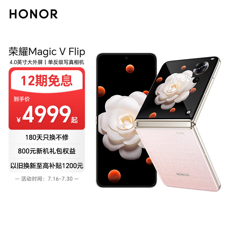 荣耀Magic V Flip 小折叠屏 4.0英寸大外屏 单反级写真相机 青海湖电池 5G AI 拍照手机 12+256 香槟粉价格:4999.00元!