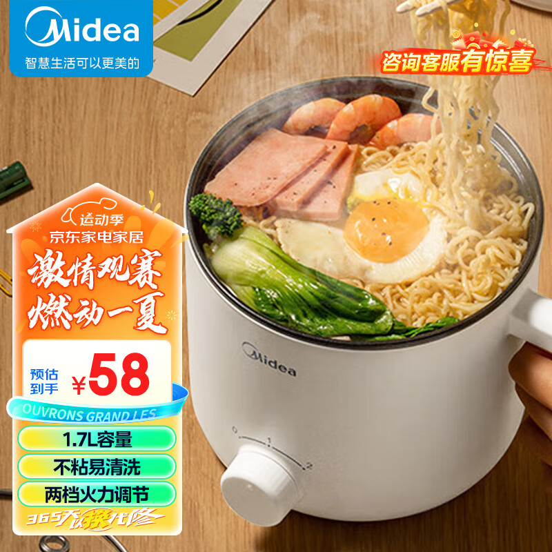 美的(Midea)电煮锅 电热锅 小电锅 宿舍小锅 电蒸锅 学生寝室一体泡面小火锅多功能锅 XZE1612 1.7L价格:58.00元!