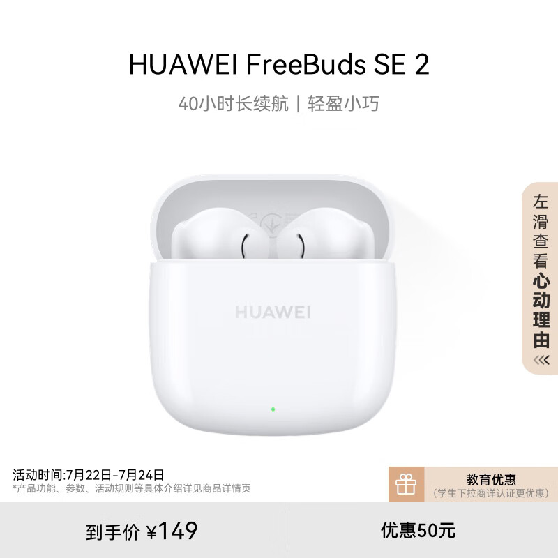 华为长续航蓝牙耳机 FreeBuds SE 2无线耳机 40小时长续航 快速充电 蓝牙5.3适用于苹果/安卓手机 白价格:149.00元!