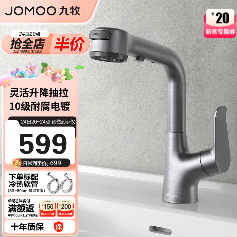 九牧(JOMOO)多功能面盆龙头双控洗脸盆一键止水升降抽拉龙头32399-649/HBS1-Z价格:699.00元!
