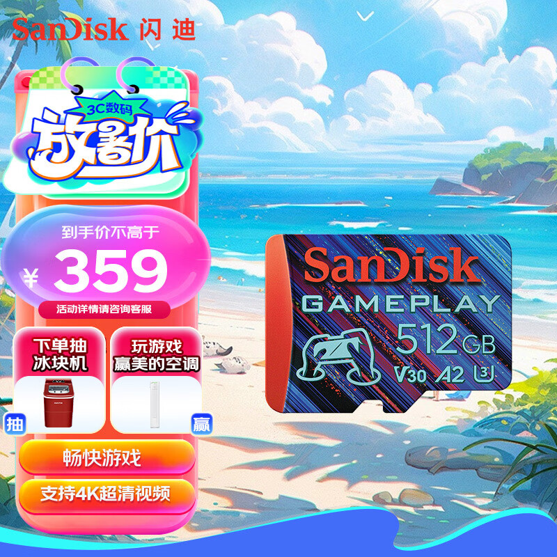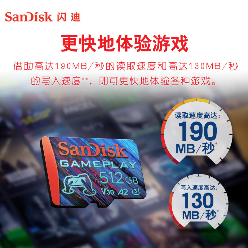 闪迪(SanDisk)512GB TF内存卡 A2 U3 V30 4K 游戏存储卡 读速190MB/s 写速130MB/s 游戏不卡顿 游戏机掌机专用卡价格:359.00元!