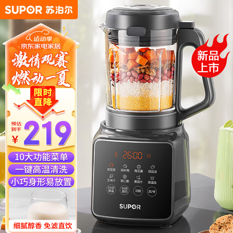 苏泊尔(SUPOR)降噪破壁机 家用1.2L多功能可预约柔音免滤豆浆机辅食机早餐机榨汁机 SPJ002S价格:219.00元!