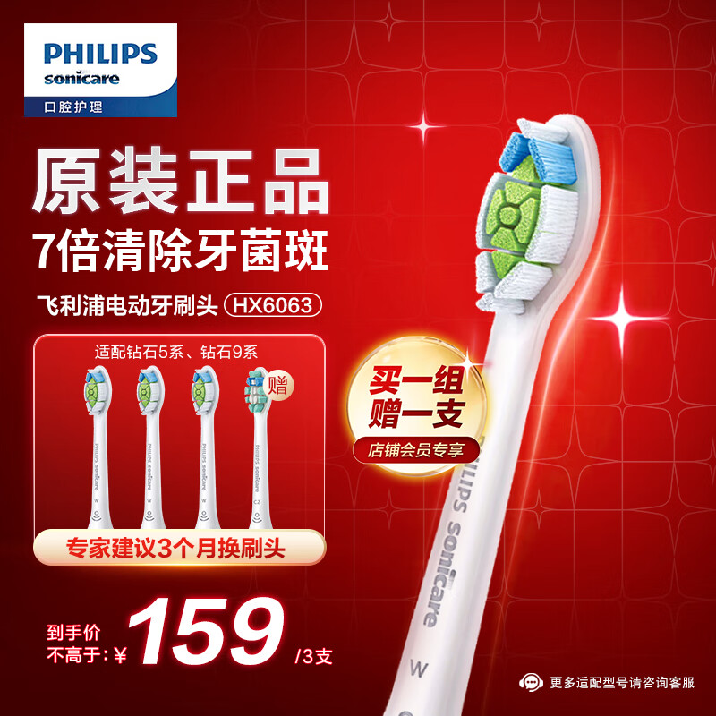 飞利浦(PHILIPS)电动牙刷刷头 钻石亮白型刷头W2 HX6063/67 3支装 白色 适配钻石5系、9系价格:159.00元!