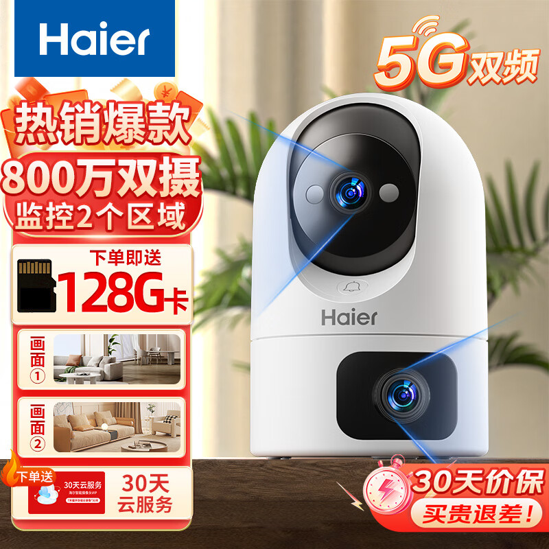 海尔(Haier)800万双摄家用摄像头手机无线远程监控器360度无死角带夜视全景语音自动旋转可对话室内外云台价格:272.00元!