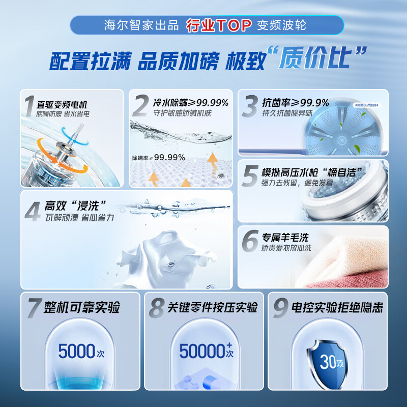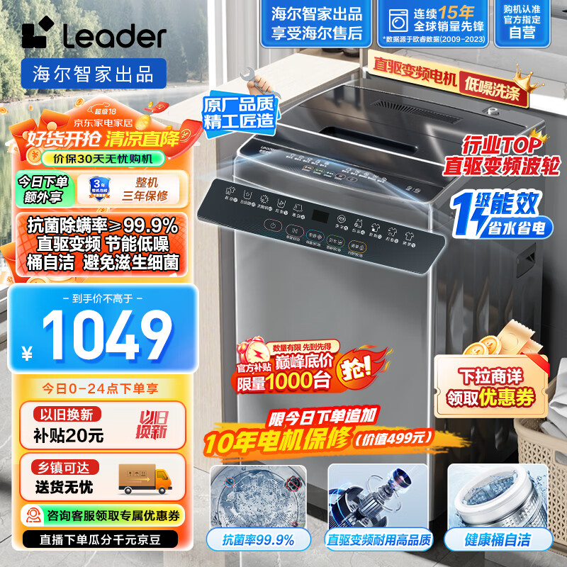 Leader海尔智家出品 波轮洗衣机全自动 10公斤958 直驱变频电机 健康除螨洗 桶自洁 原厂品质 @B100BM958价格:1049.00元!