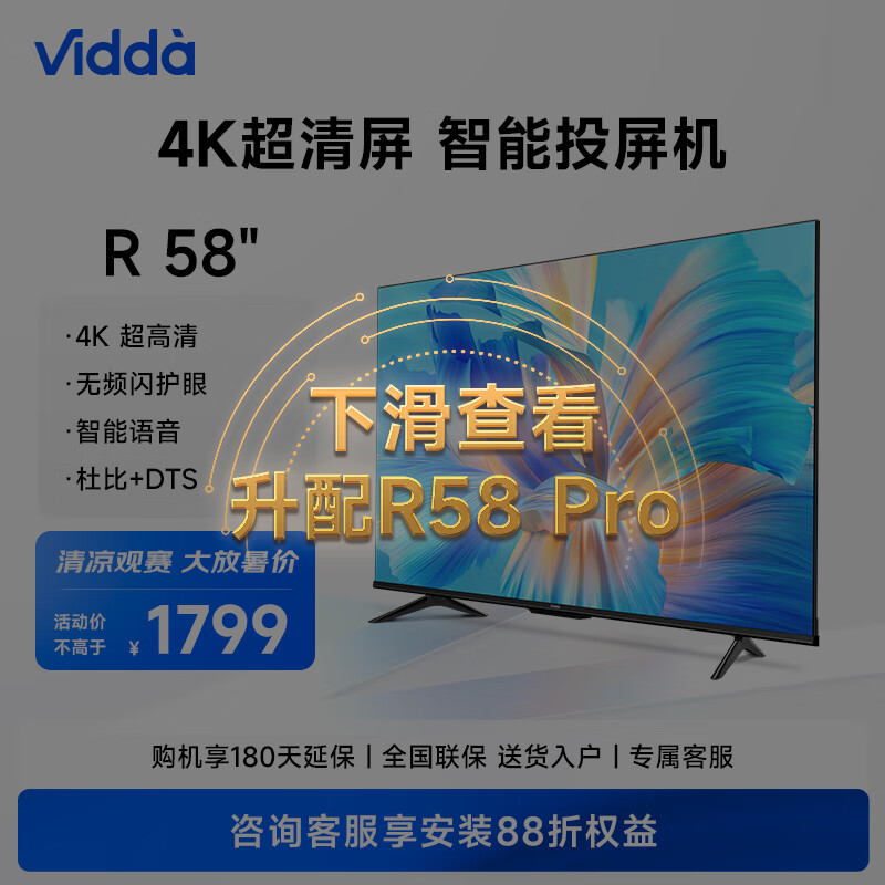 Vidda R58 海信电视 58英寸 1.5+8GB 4K智慧屏 游戏智能液晶巨幕大屏电视以旧换新58V1F-R价格:1799.00元!