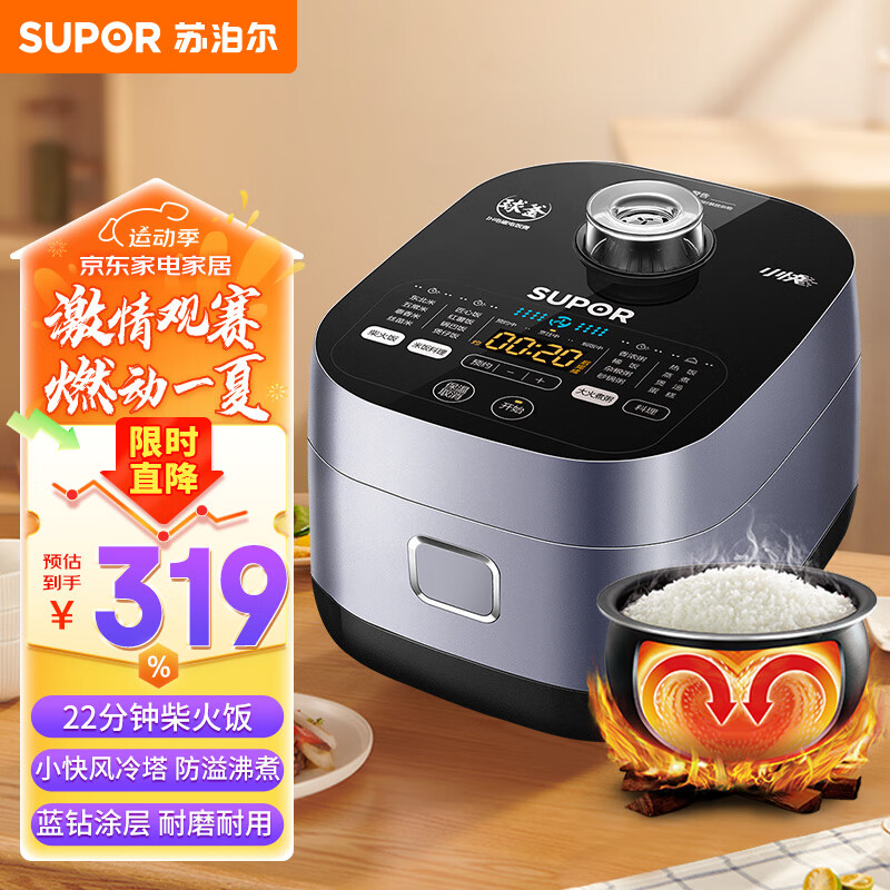 苏泊尔(SUPOR)电饭煲蓝钻小快球釜电饭锅4L 3-8人22分钟柴火饭16种多功能智能电饭煲40FC661新老品随机发货价格:359.00元!