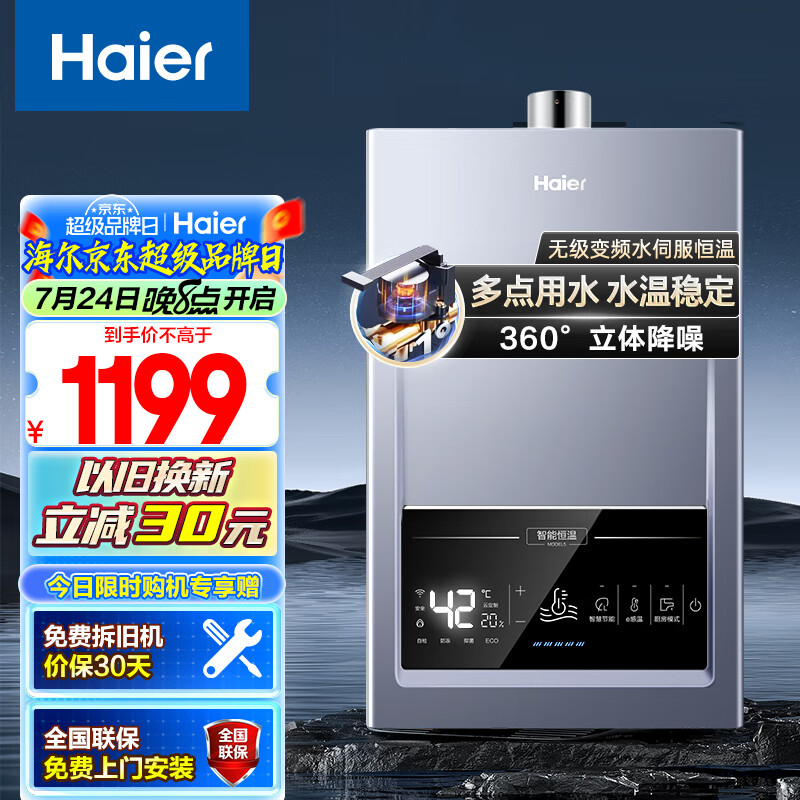 海尔(Haier)13升燃气热水器天然气 无级变频水伺服静音降噪节能低水压启动JSQ25-13MODEL5(12T)U1【以旧换新】价格:1299.00元!