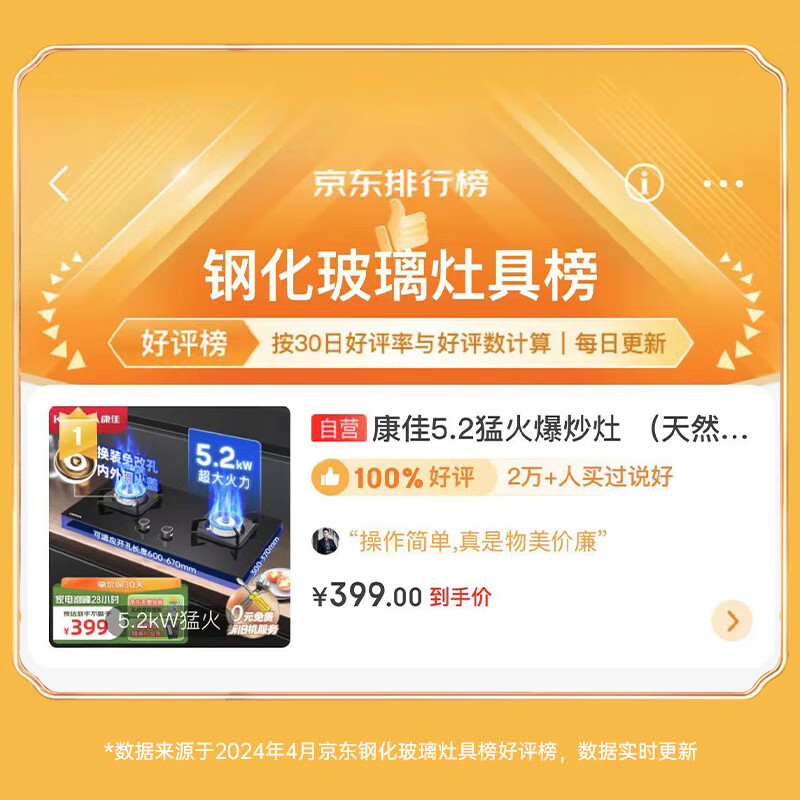 康佳(KONKA)燃气灶双灶具 5.2kW猛火灶 台式/嵌入式 兼容性底盘免扩孔 铜火盖铝炉头 JZT-B500F(天然气)价格:399.00元!