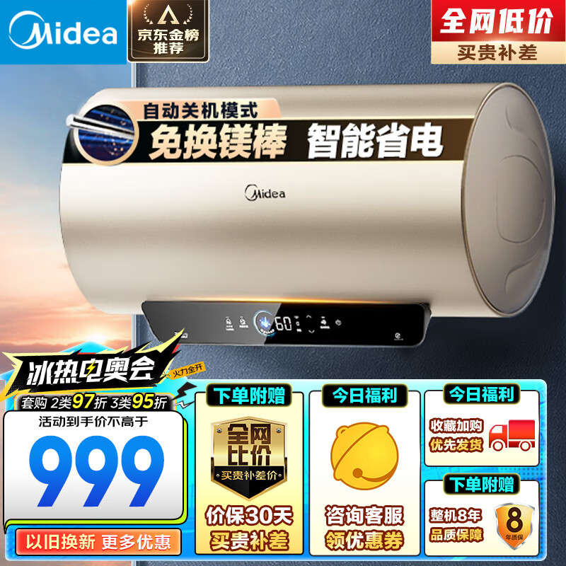 美的(Midea)终身免换镁棒60升电热水器储水式2500W速热大水量一级能效节能APP智能省电自动关机F6025-JE4(HE)价格:1199.00元!