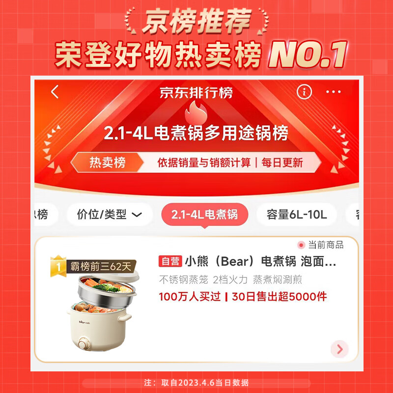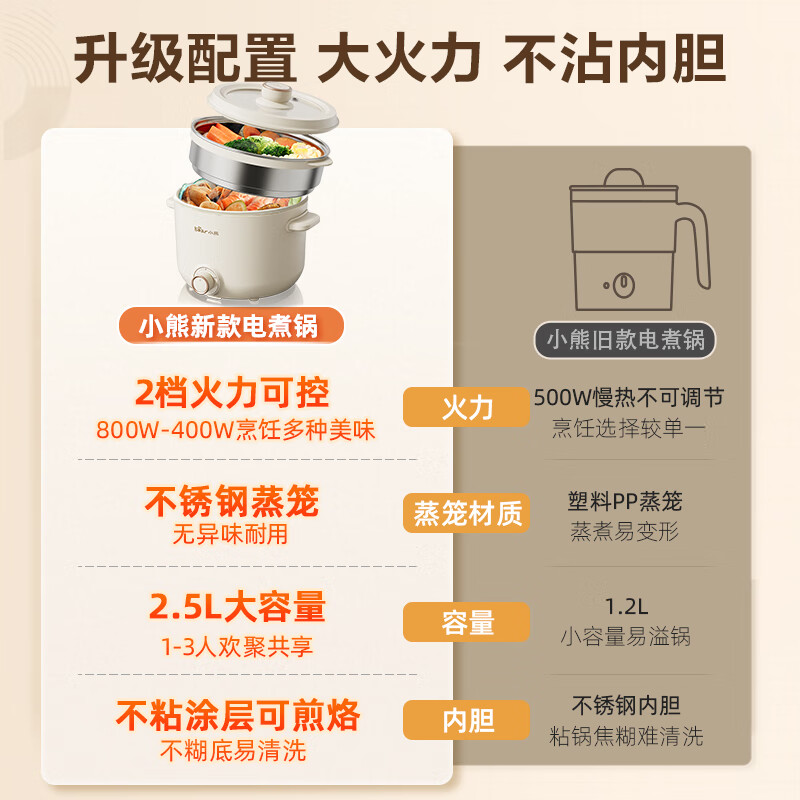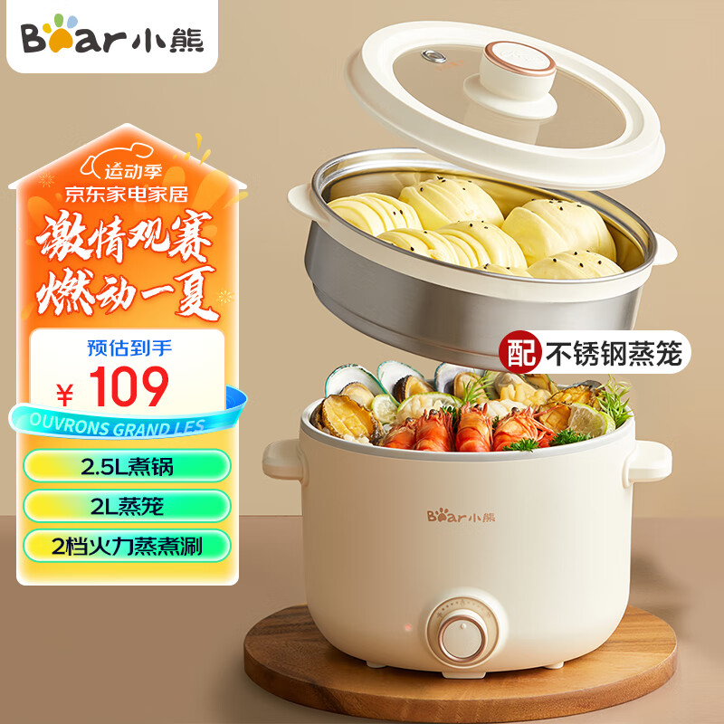 小熊(Bear)电煮锅 泡面火锅宿舍小电锅 多功能多用途电热锅 2.5L蒸煮一体蒸屉蒸笼电蒸锅 DRG-E25H1价格:109.00元!