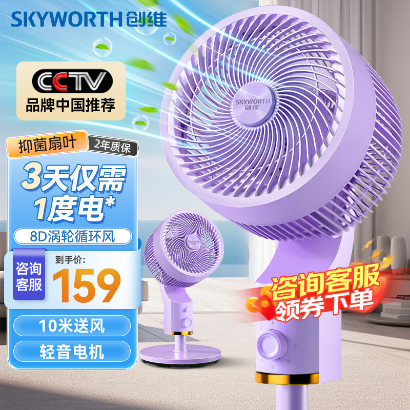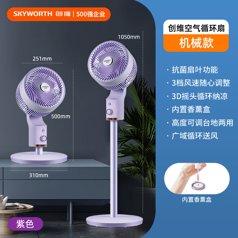 创维(Skyworth)【直播热销】电风扇空气循环扇落地扇智家用大风力轻音台地两用循环风扇Q858浅紫色价格:159.00元!