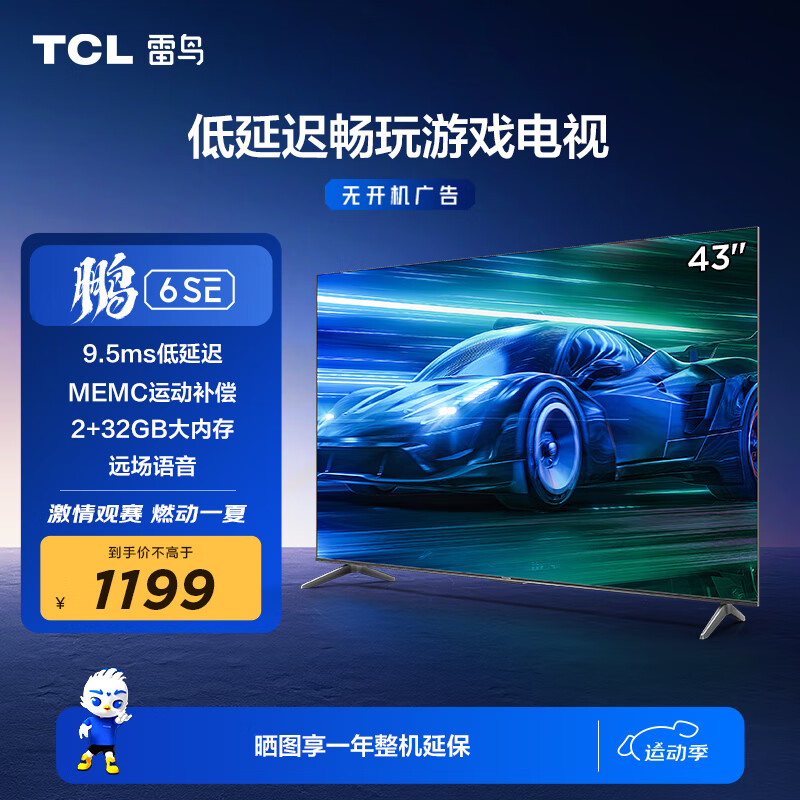 TCL雷鸟 鹏6SE 43英寸4K超清电视 MEMC防抖 2+32G大内存 USB3.0 远场语音 智能游戏平板电视机43S365C价格:1199.00元!