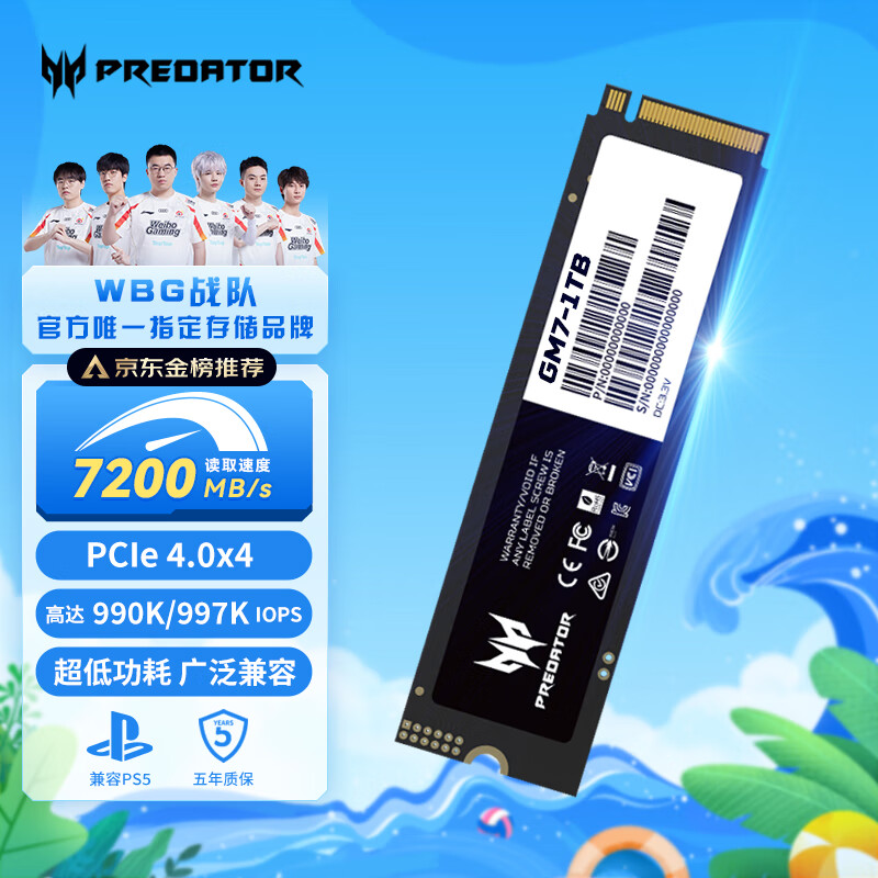 宏碁掠夺者(PREDATOR)1TB SSD固态硬盘 M.2接口(NVMe协议) GM7系列|NVMe PCIe 4.0读速7200MB/s AI电脑存储配件价格:579.00元!