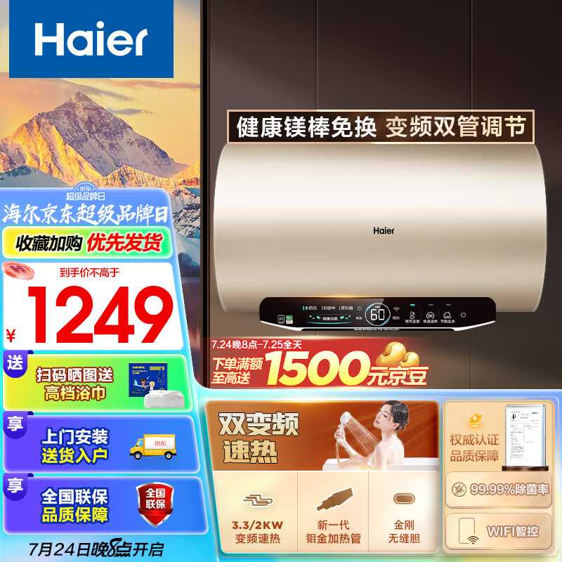 海尔(Haier)60升【金刚无缝胆】3300W变频速热电热水器储水式大水量免换镁棒一级能效EC6002-JT3U1 以旧换新价格:1349.00元!