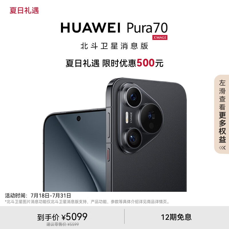 华为(HUAWEI)Pura 70 12GB+256G 羽砂黑 北斗卫星消息版 超高速风驰闪拍 第二代昆仑玻璃 华为P70智能手机价格:5099.00元!