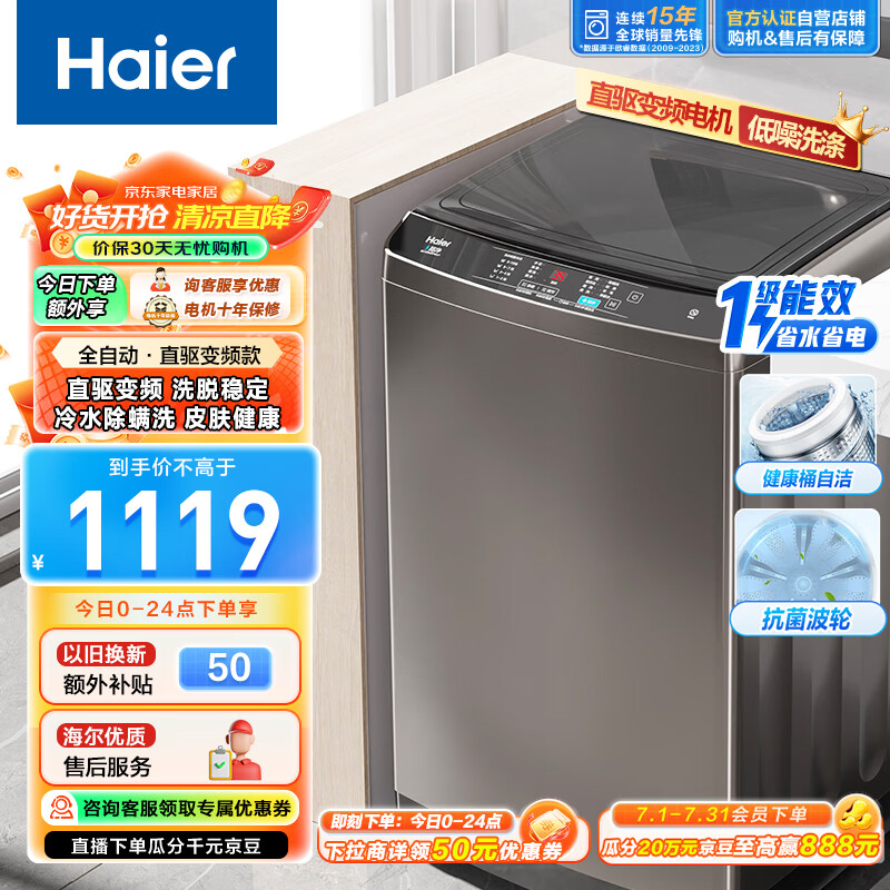 海尔(Haier)波轮洗衣机全自动家用 10公斤大容量 直驱变频 一级能效 除螨洗 桶自洁 以旧换新EB100B20Mate1价格:1169.00元!