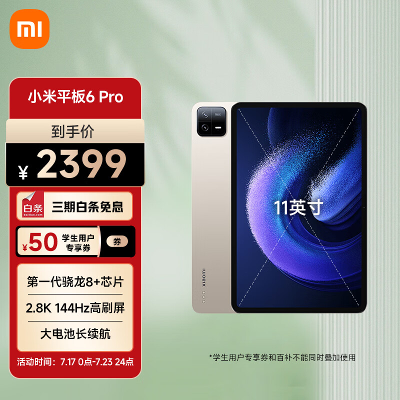 小米平板6Pro xiaomiPad 11英寸 骁龙8+强芯 144Hz高刷 2.8K超清 8+256GB 移动办公娱乐平板电脑金色价格:2399.00元!