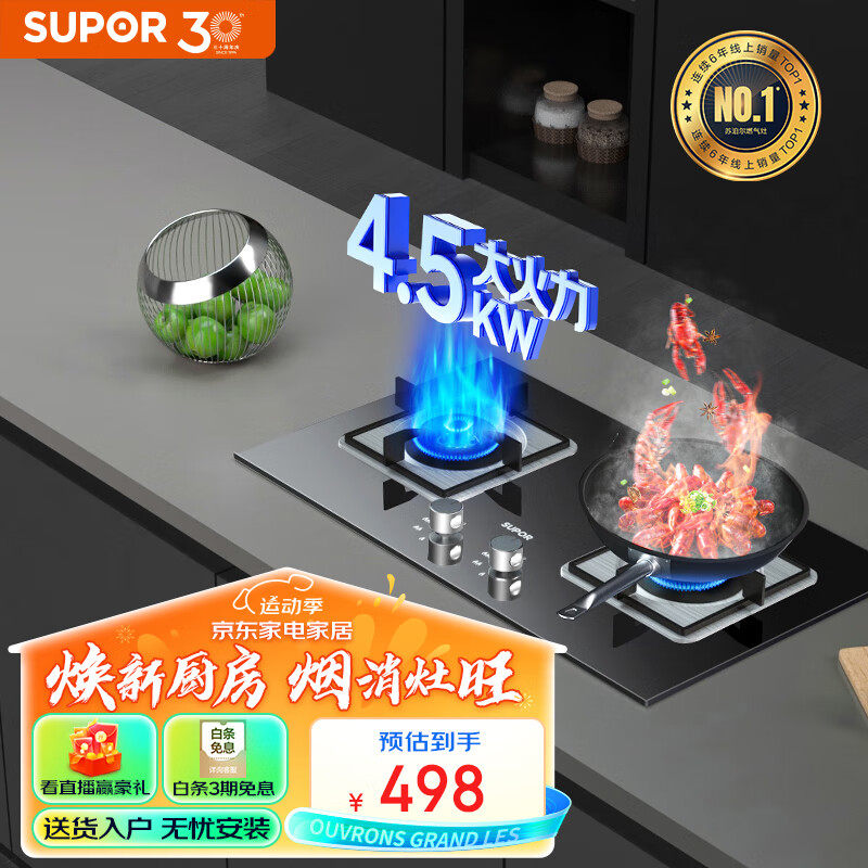 苏泊尔(SUPOR)燃气灶 天然气灶双灶具4.5kW大火力 钢化玻璃双灶台嵌两用燃气灶 猛火高效QB506天价格:498.00元!
