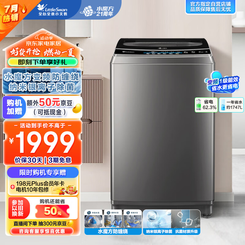 小天鹅(LittleSwan)波轮洗衣机全自动 水魔方系列 【TB100TEC】 变频防缠绕 健康除菌螨 直驱 以旧换新 10公斤价格:1999.00元!
