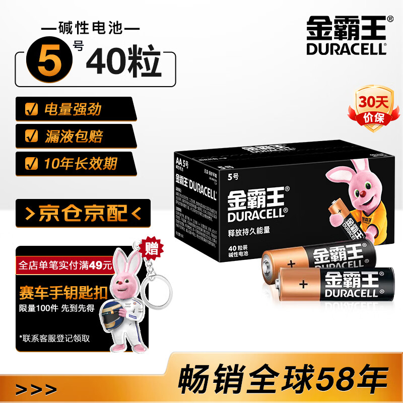 金霸王(Duracell)5号电池40粒装碱性干电池五号 适用博朗耳温枪/血氧仪/鼠标血压计电子秤遥控器儿童玩具价格:97.00元!