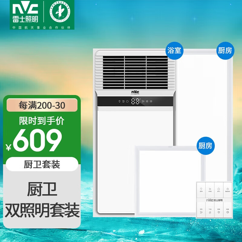 雷士(NVC)厨卫套餐八合一智能风暖浴霸大屏照明暖风机浴室 适用于集成吊顶价格:699.00元!