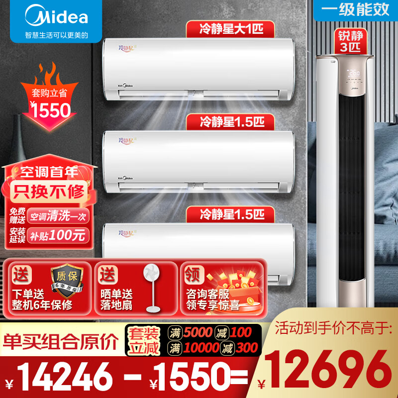美的(Midea)空调套装三室一厅新一级能效全直流变频冷暖空调一套购齐低噪双节能大风量冷静星挂机+锐静柜机价格:12696.00元!