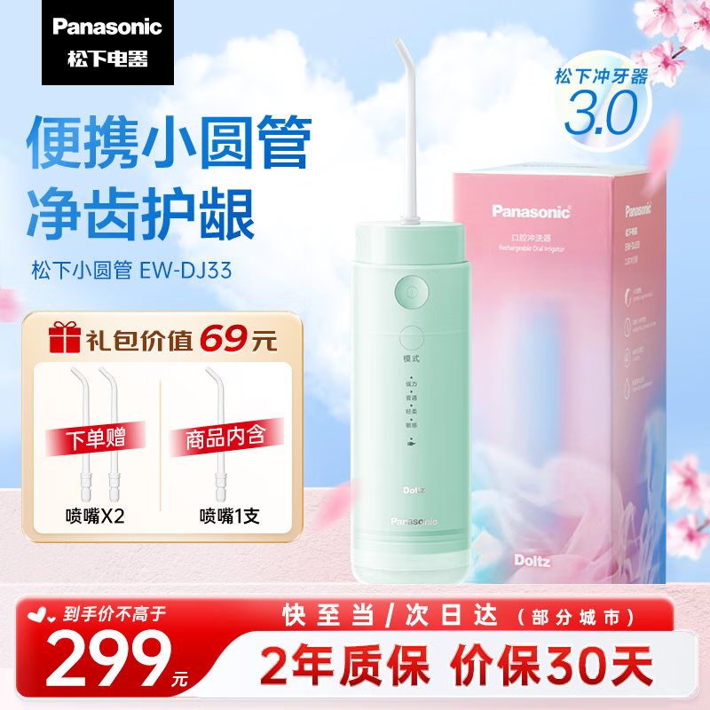 松下(Panasonic)冲牙器洗牙器水牙线 高频脉冲水流小巧便携伸缩小圆管情侣七夕情人礼物送男友送女友DJ33青柠绿价格:299.00元!