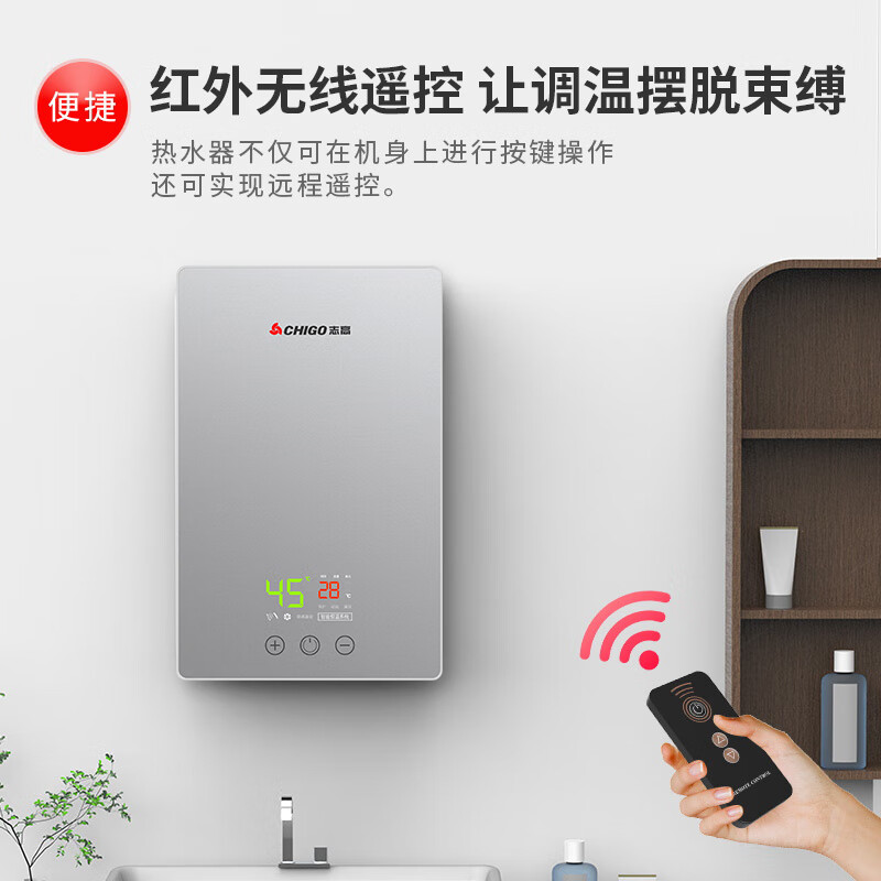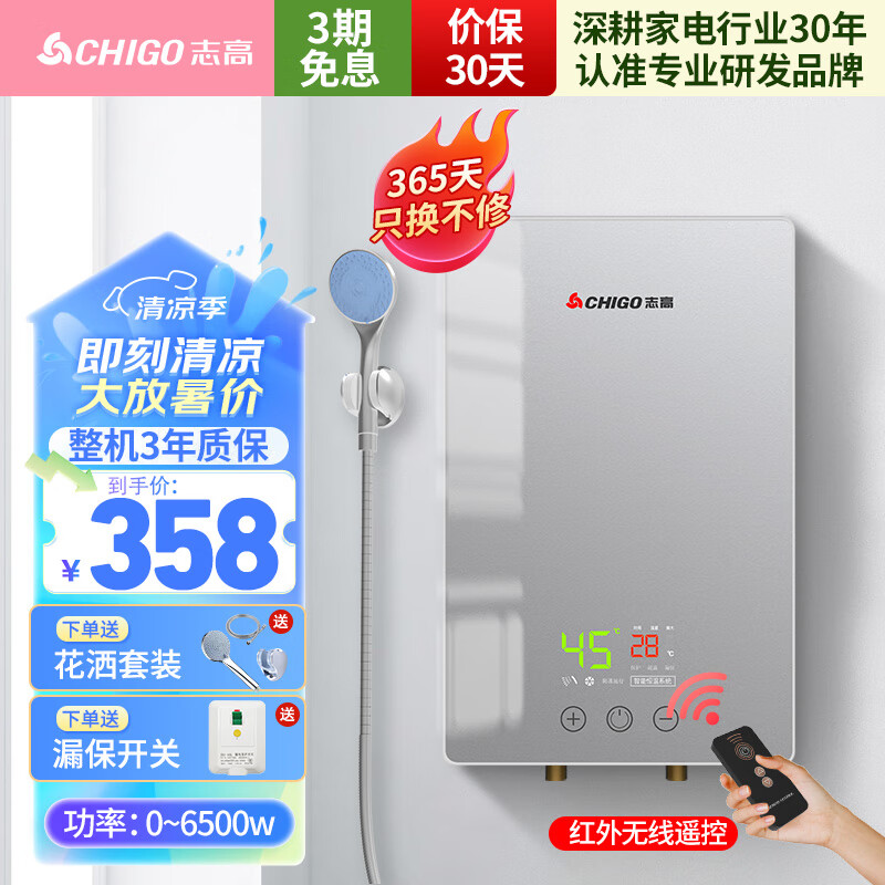 志高(CHIGO)即热式电热水器 6500W小厨宝快速即热热水器家用集成淋浴洗澡免储水功率可调带漏保遥控款 KBR-B65价格:358.00元!