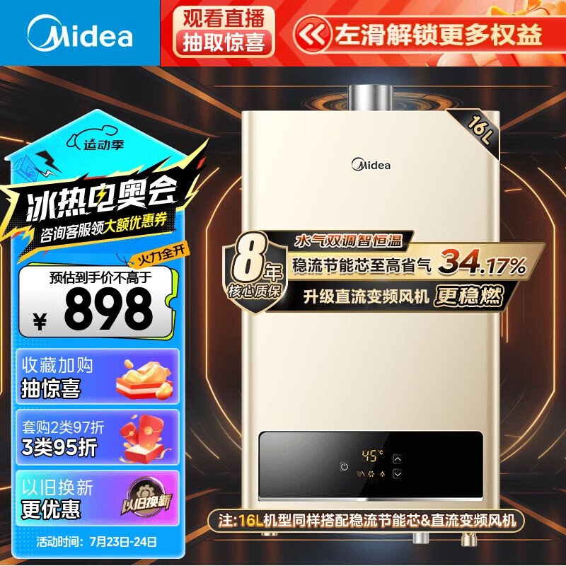 美的(Midea)16升燃气热水器 天然气 智能恒温 水气双调 低水压启动 大屏显示 以旧换新JSQ30-HWA价格:898.00元!