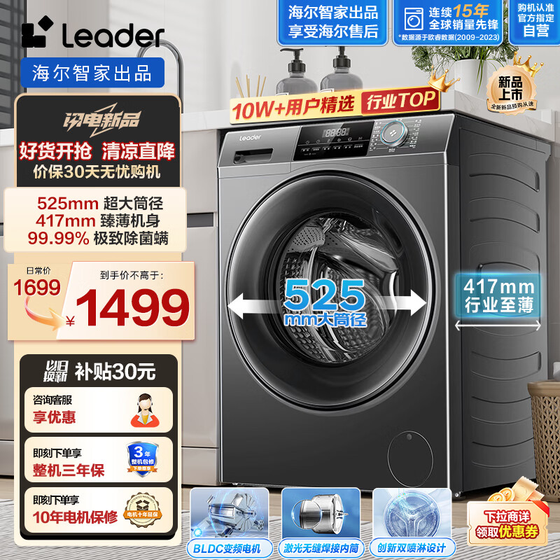 Leader海尔智家出品 滚筒洗衣机全自动家用小型8公斤大容量超薄平嵌大筒径变频电机以旧换新@G80B22SGTD价格:1489.00元!