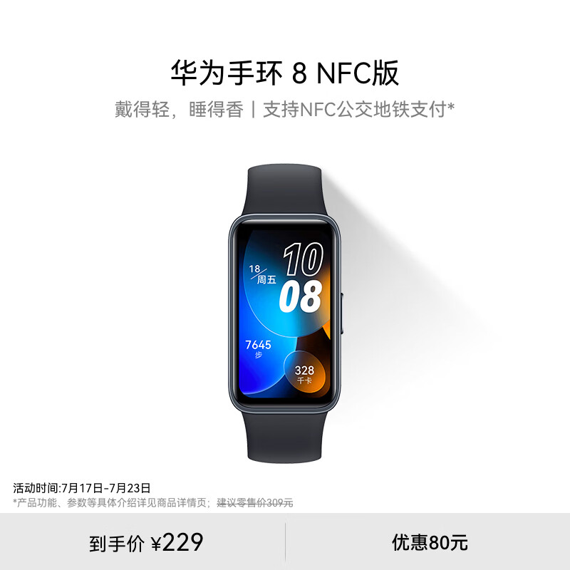 华为手环 8 NFC版华为手环智能手环快充长续航 支持NFC功能 电子门禁 快捷支付 公交地铁 幻夜黑 男女价格:229.00元!