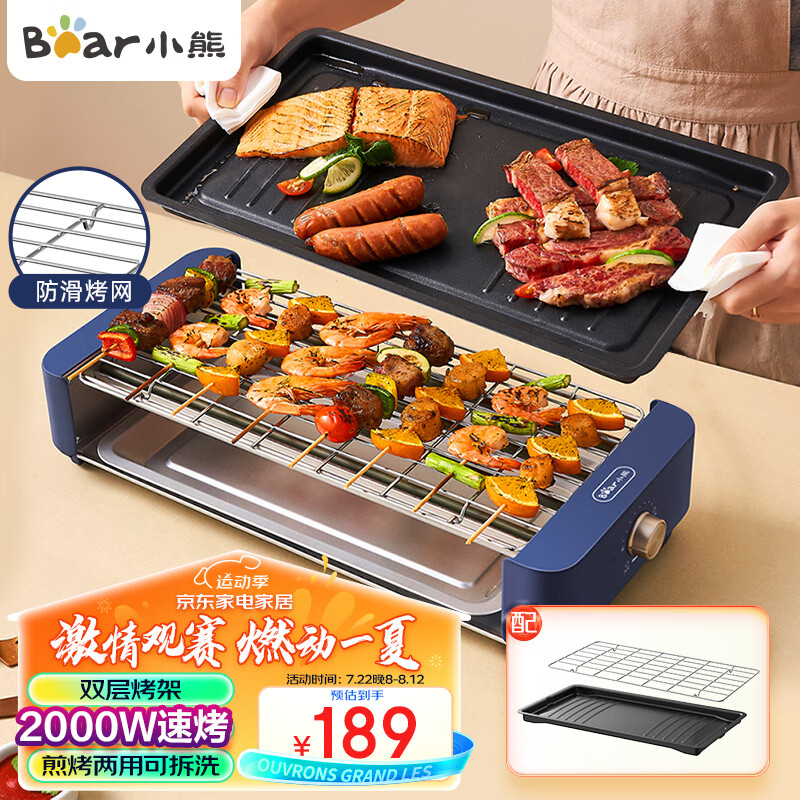 小熊(Bear)电烤炉烧烤炉电烤盘烤盘烤串机烧烤架烤肉盘家用大功率无浓烟不粘烤肉炉双层烤架DKL-E20G1价格:189.00元!