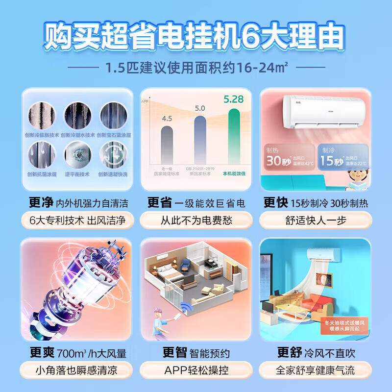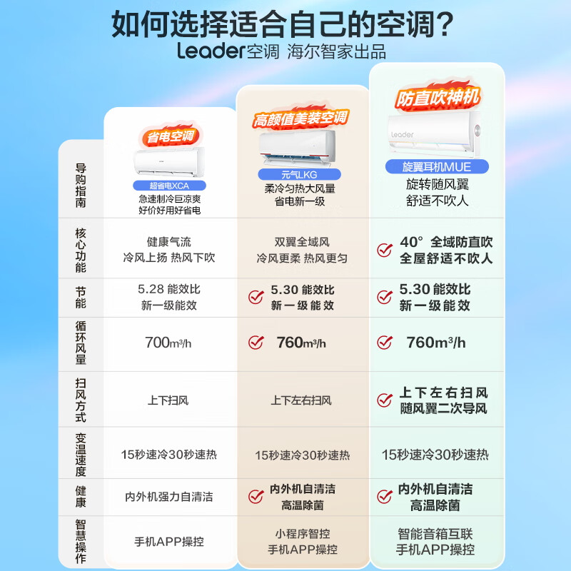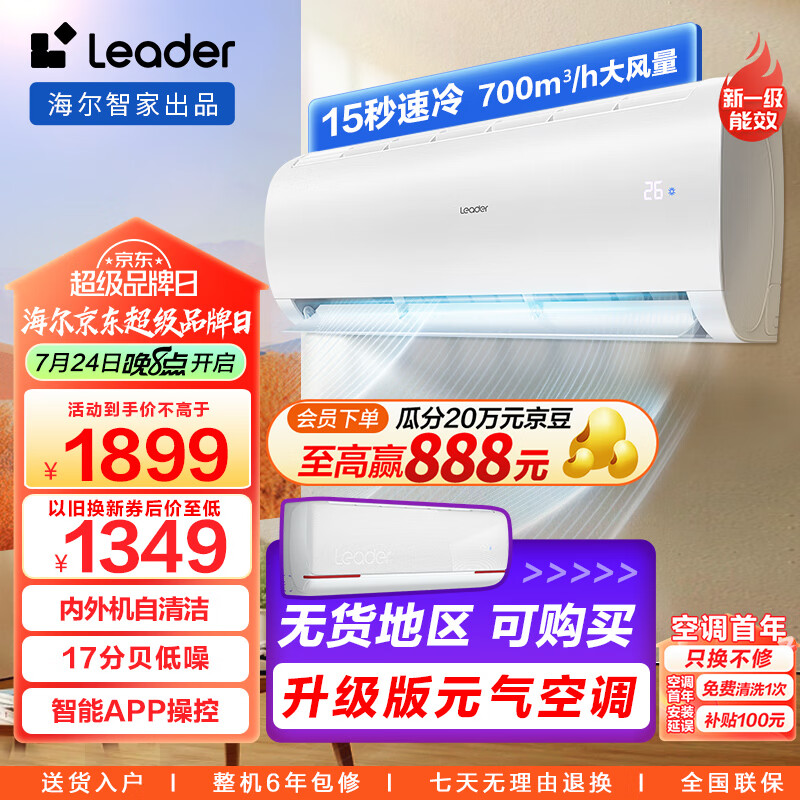 Leader空调海尔智家出品 超省电1.5匹新一级能效变频空调挂机 自清洁卧室KFR-35GW/02XCA81TU1以旧换新价格:1899.00元!