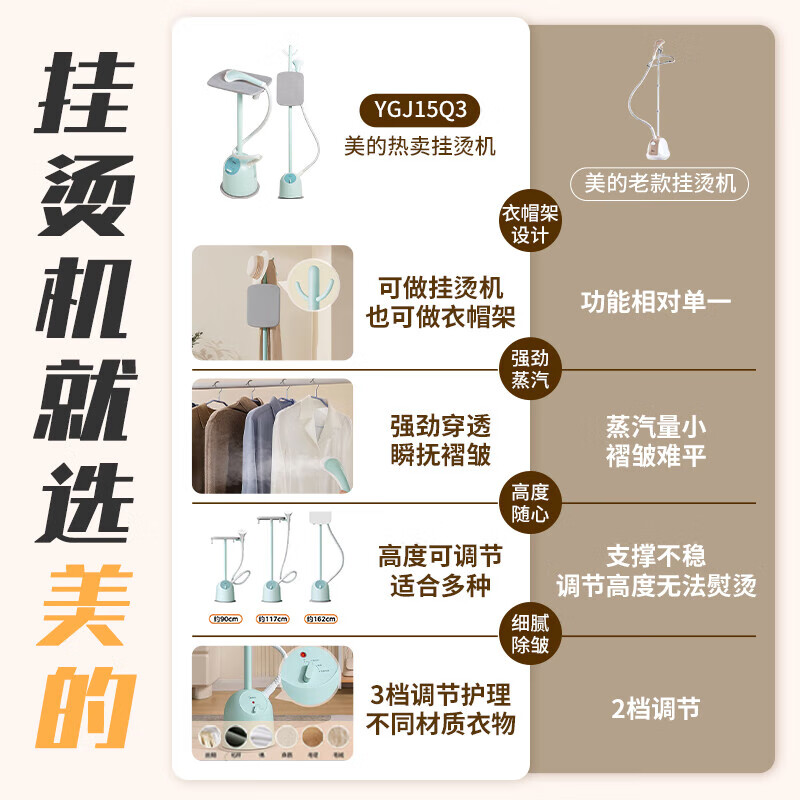 美的(Midea)【九孔强劲蒸汽】挂烫机家用 高效杀菌除螨手持蒸汽挂烫机 熨烫机熨衣机电熨斗 (带熨衣板)YGJ15Q3价格:159.00元!